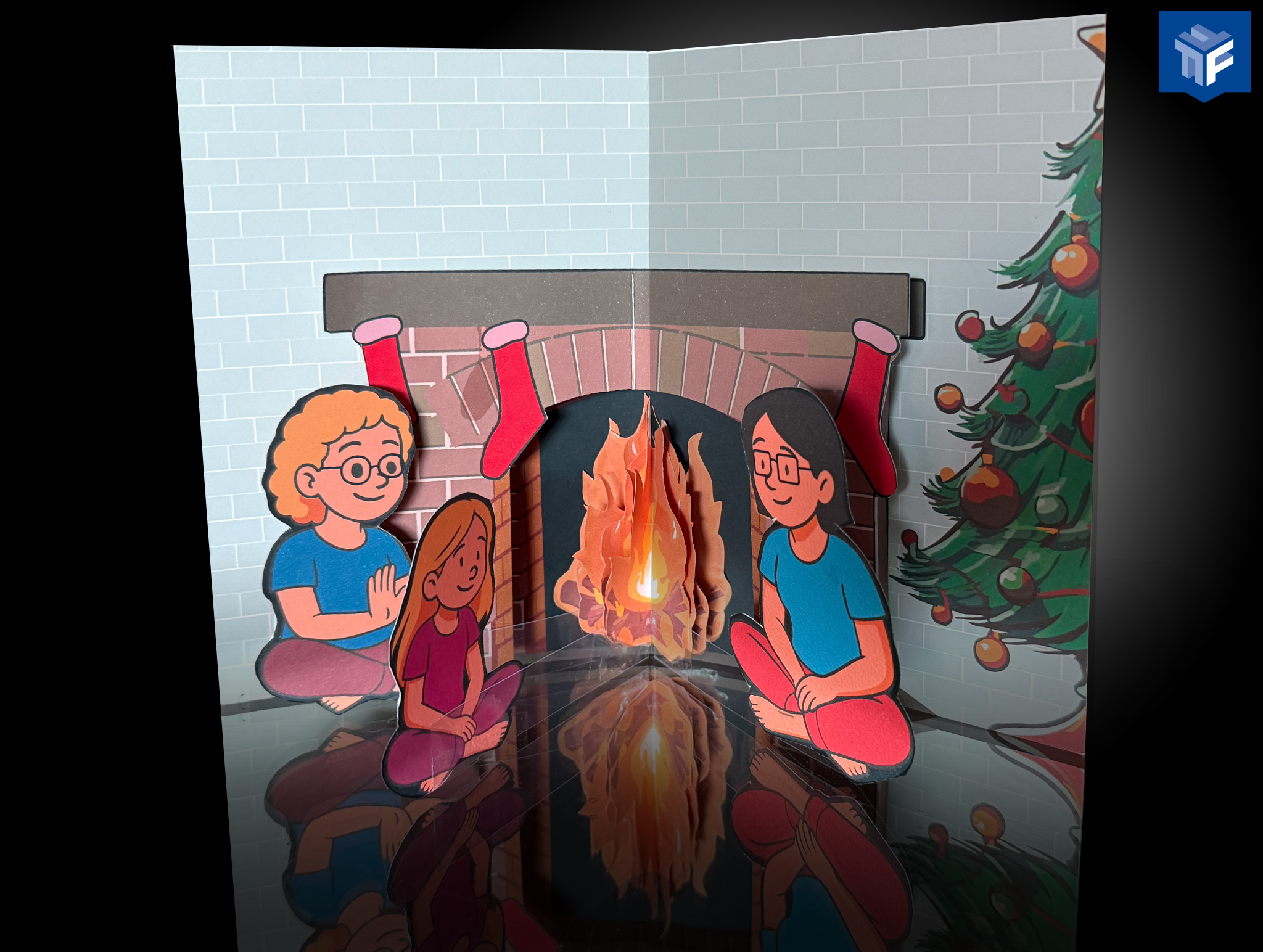 Pop-up kaart met een familie rond het openhaardvuur.