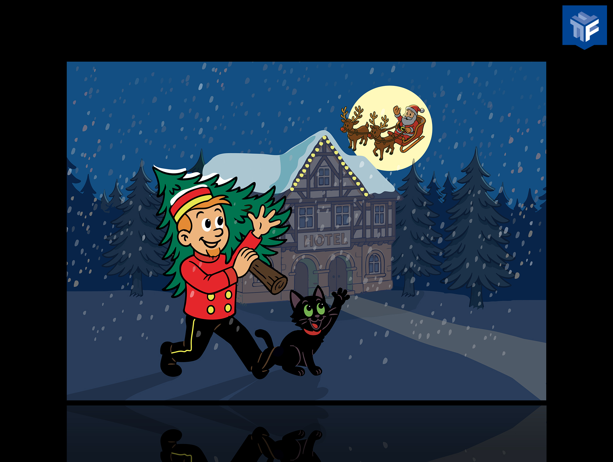 Franky en Meeko zijn druk bezig kerstsfeer te brengen in het hotel, de kerstman is ook druk bezig bij de schoorsteen in de buurt.